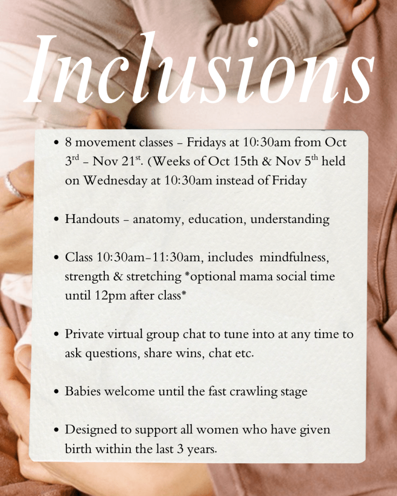Mama’s In Motion – 8 week postpartum movement sessions $165 + HST | Begins October 3rd