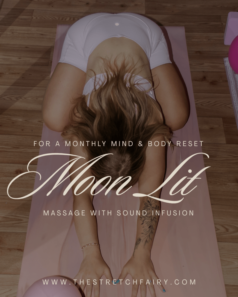 On the Thursday Closest to the full moon, join us for Moonlit Massage & Sound Infusion – a beautiful offering that includes journaling and mindfulness, restorative yoga, massage, sound healing and oracle cards. This class is a premium service included in all memberships – but does count towards *two* classes on a drop in, punch card or membership with a set class per month allowance.